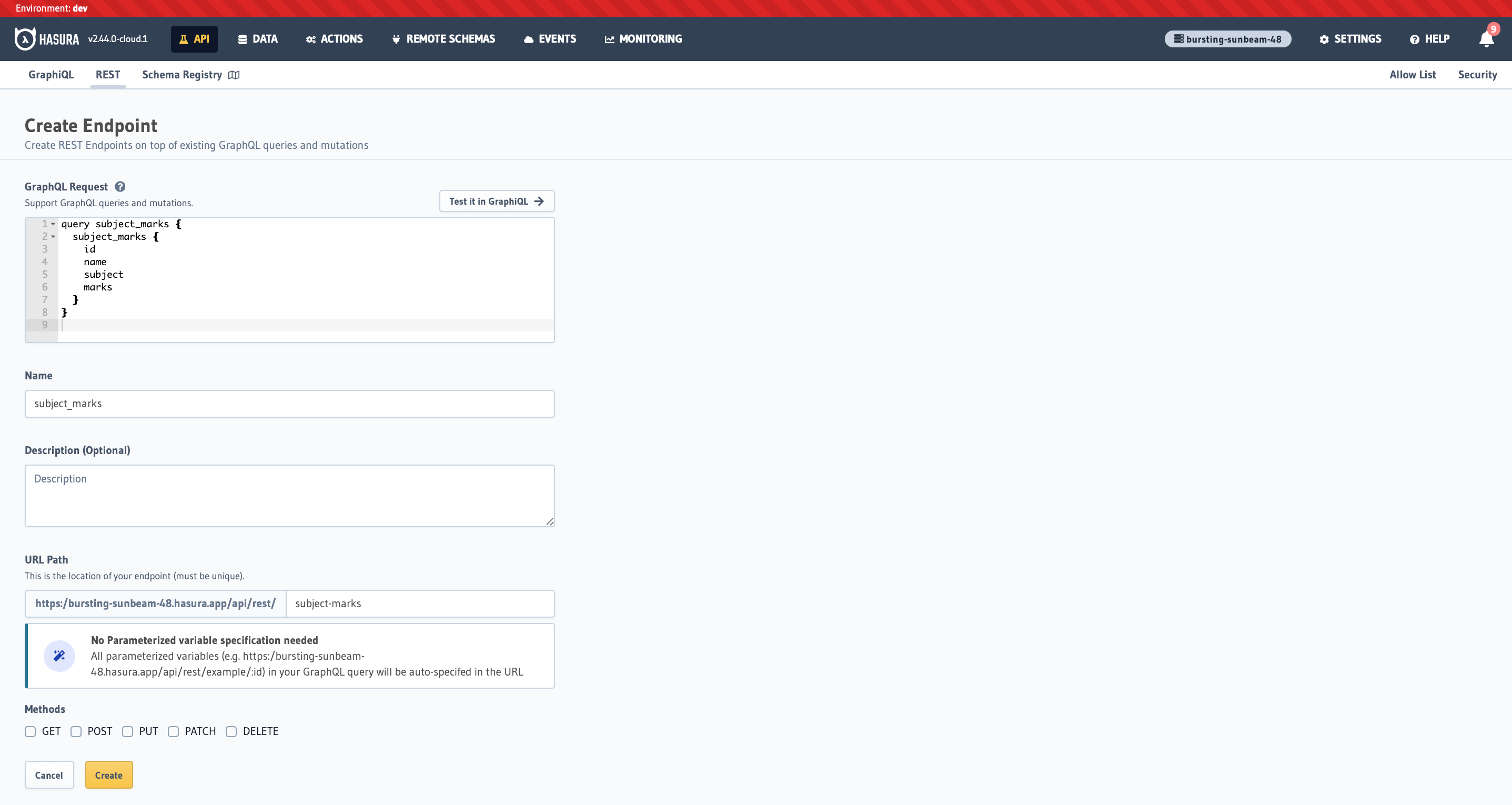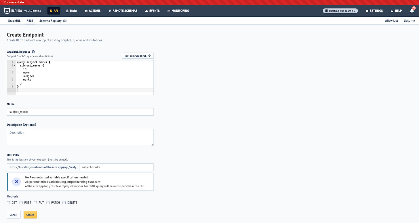 It was comically easy to make a REST endpoint on top of my data. All of the methods of GET, POST, PUT, PATCH and DELETE are available to the user while creating the endpoint. This is a great feature for systems that want to leverage everything that Hasura offers, without having to switch to a GraphQL API.