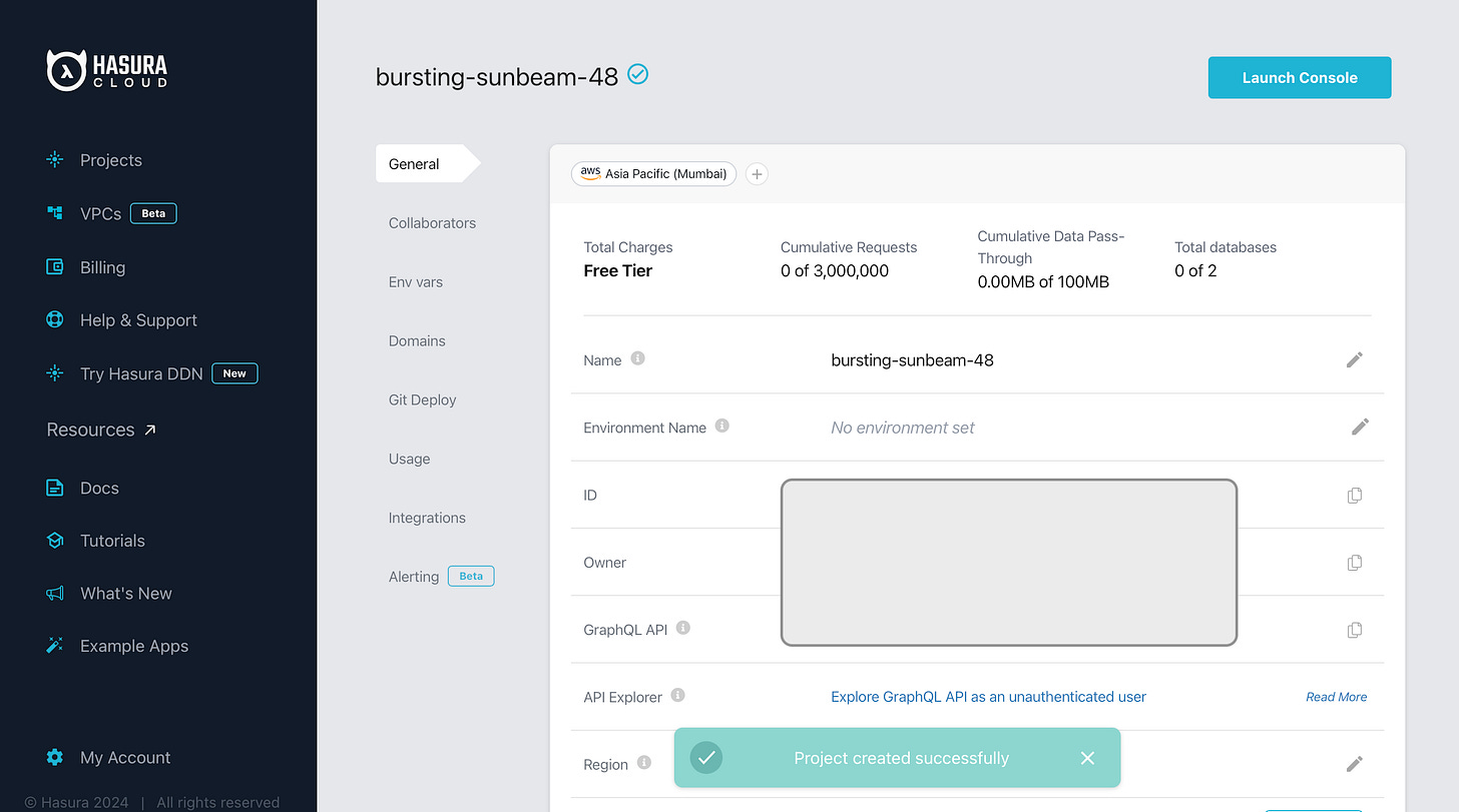 I created an account on Hasura.io and chose the free-tier for my experimentation. This did not require a credit card, which was very welcome. I chose AWS as my cloud provider for this demo and I was surprised to see this setup becoming available to me in under 30 seconds. Here’s how my account looked like, after creation.