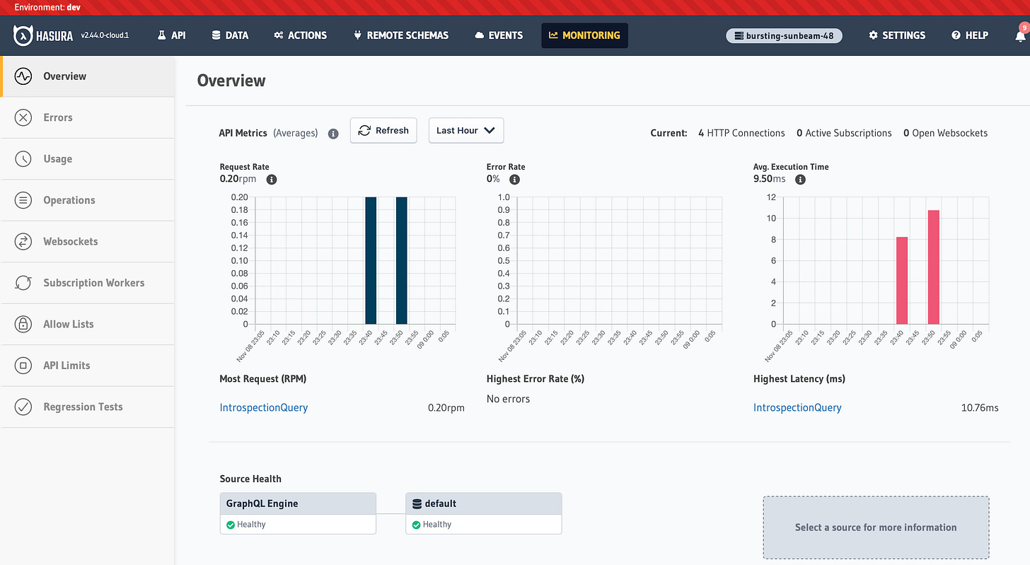 Hasura's GraphQL Engine includes several built-in monitoring features and integrates with external monitoring tools to help users track, optimize, and troubleshoot their API performance. Here are the main monitoring features available in Hasura: