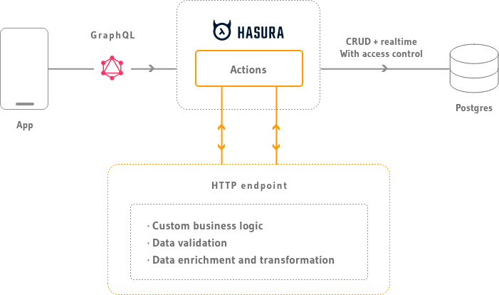 Actions in Hasura are custom queries or mutations that are resolved via HTTP handlers. Actions can be used to carry out complex data validations, data enrichment from external sources or execute just about any custom business logic.