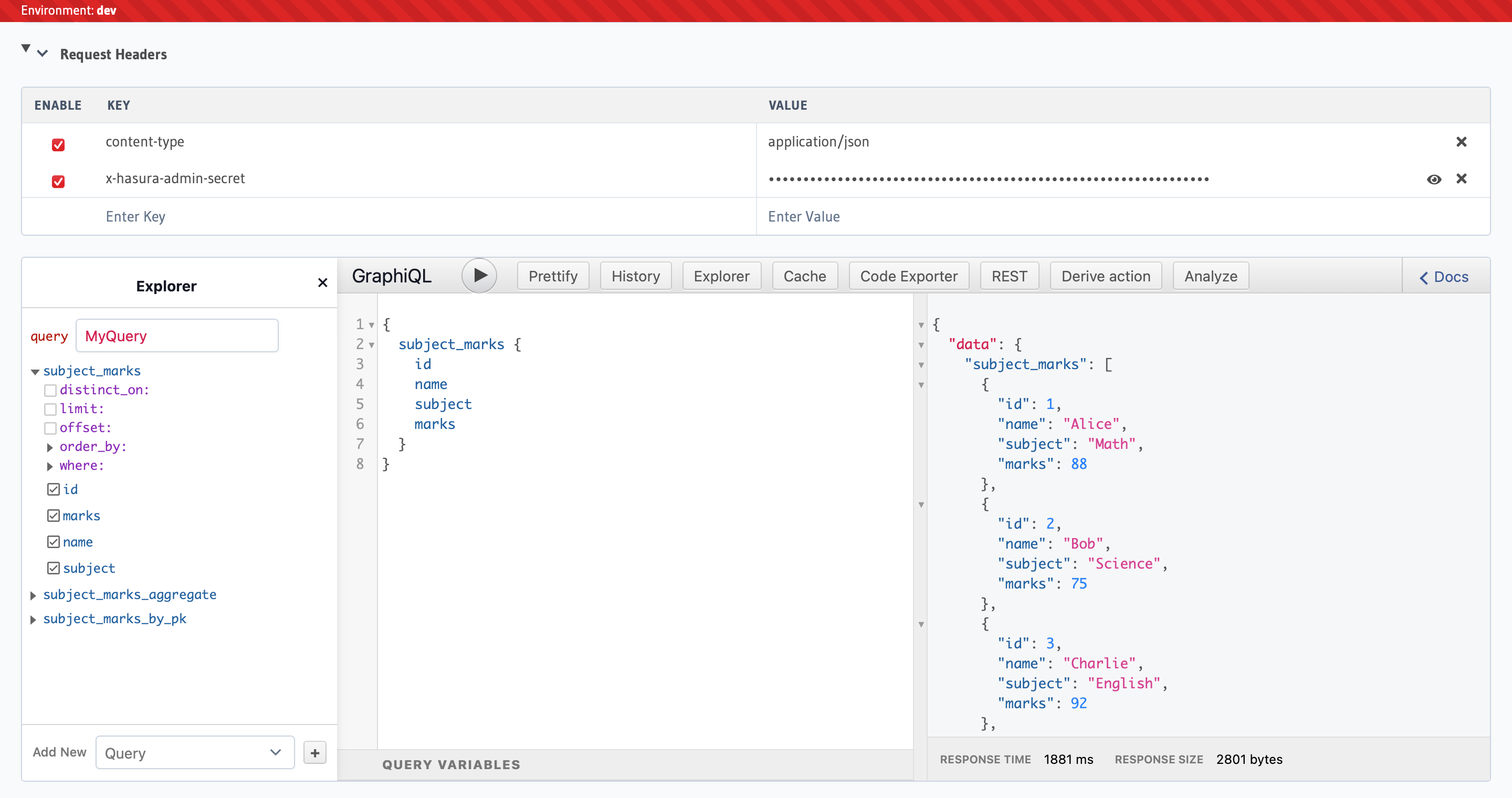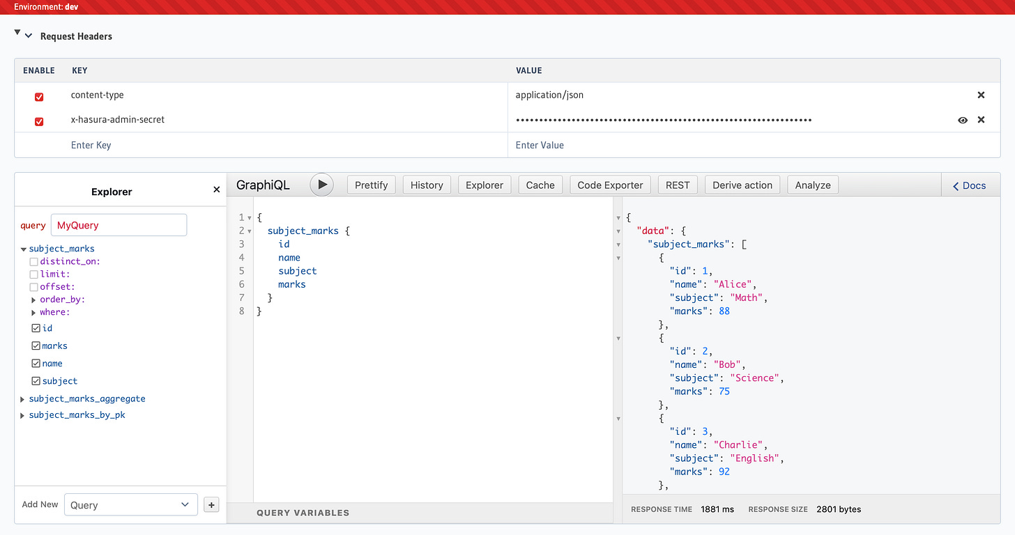Now that my table was created and the data became available, it was time to start exploring the graphql API. And voila! This happened instantly. The moment my database connection became available, the API was ready to go. This is absolutely amazing because I can start using this API in a web application right away.