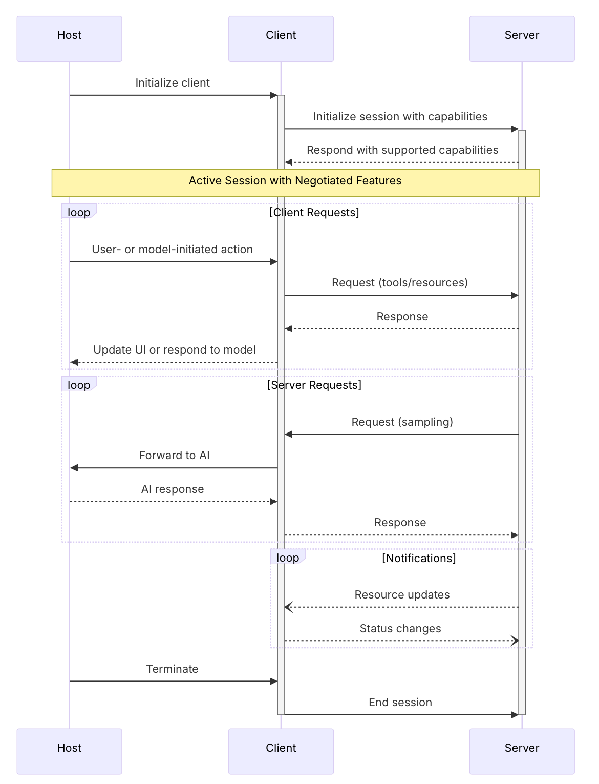 Each MCP client is created by the host and maintains an isolated, stateful JSON RPC session with a specific server. Clients handle protocol negotiation, capability exchange, bidirectional message routing, subscriptions, and notifications, while maintaining security boundaries between servers. There is a 1:1 relationship between a client and a server. One host can spin up multiple MCP clients to interact with multiple MCP servers.